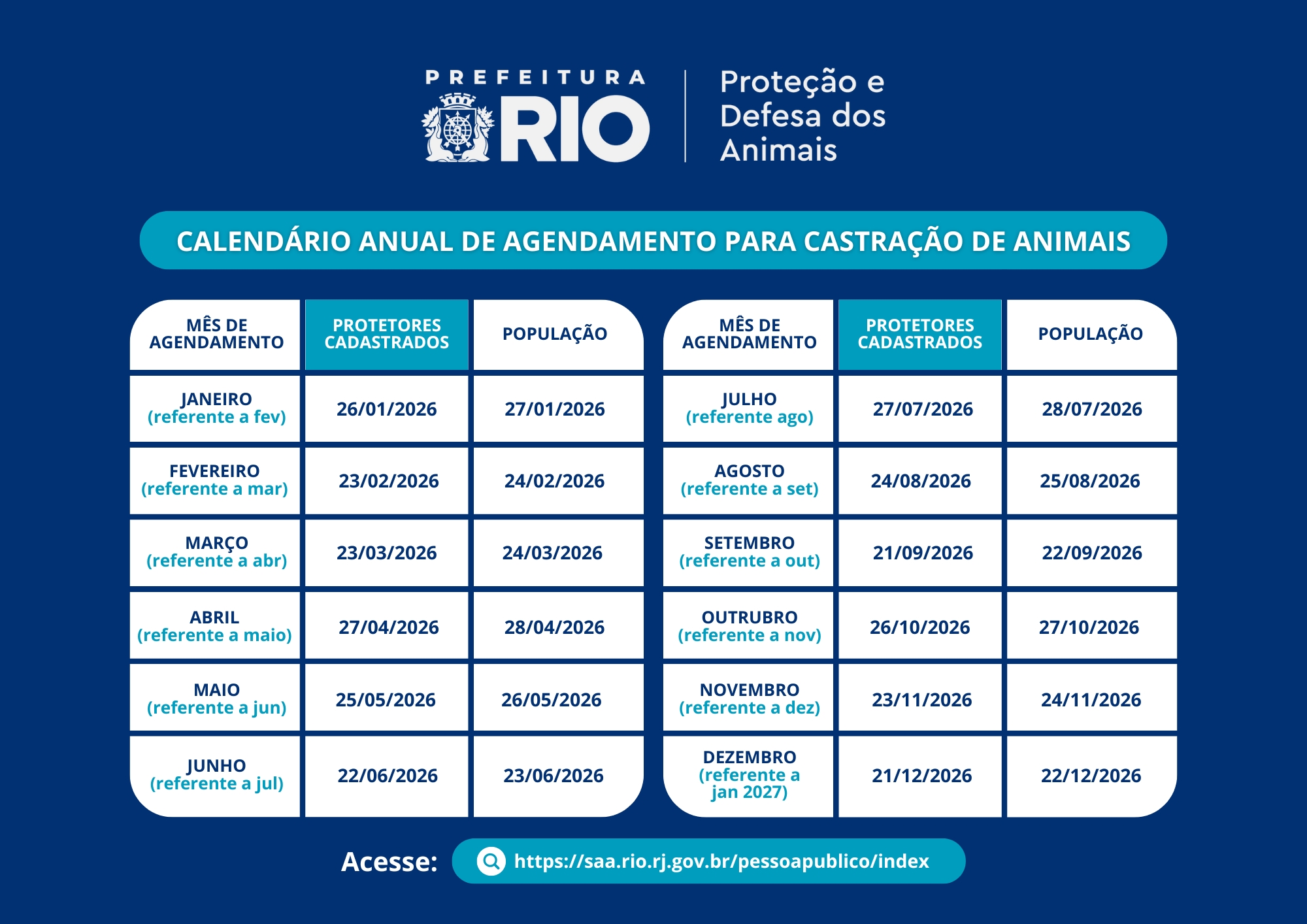 A SMPDA disponibiliza o calendário atualizado de castrações do Programa Bicho Rio, com datas específicas para protetores cadastrados e para a população em geral.